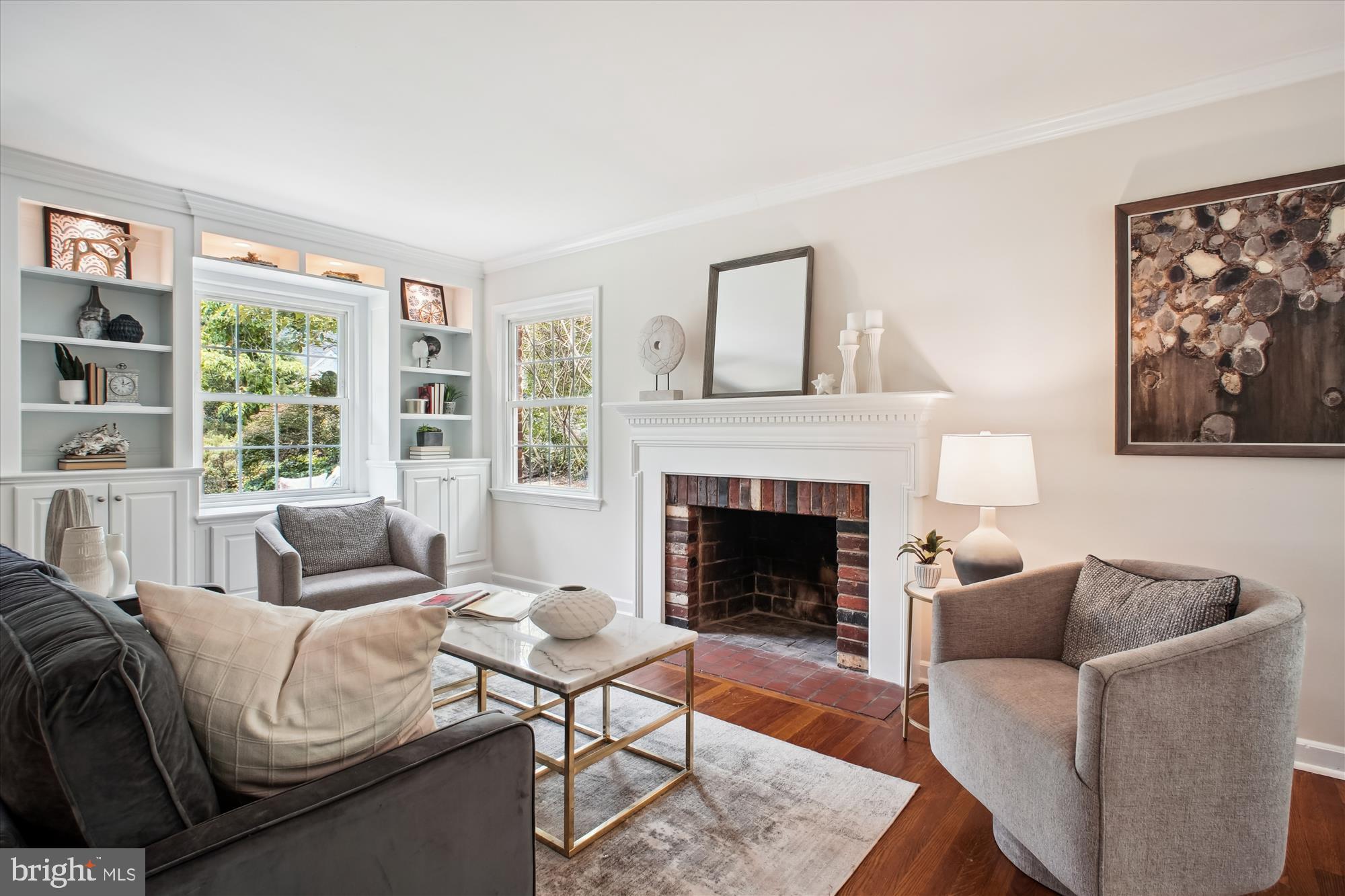 This charming, move-in ready home offers the ease of one-level living with thoughtful updates throughout. Featuring three bedrooms and two full bathrooms, the home welcomes you with a light-filled living room complete with a wood-burning fireplace and built-in shelving, leading to a lovely dining area.